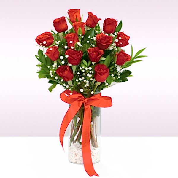 15 Adet Kırmızı Gül Cipso Ve Yeşillikler Cam Vazo Beyaz Taşlar