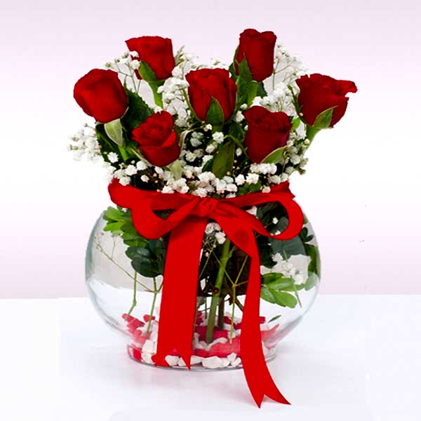 7 Adet Kırmızı Gül Cam Fanus Cipso Ve Yeşillikler Kırmızı Ve Beyaz Taşlar