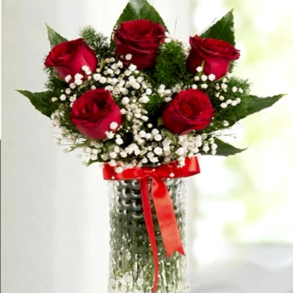 Yaklaşık Ürün Boyutu: 30cm Cam vazoda beyaz cipsolarla süslenmiş 5 adet kırmızı gül. Kırmızı gül aşkı simgeler. Aşk deyince akla gelen ilk şey kırmızı güller, şimdi sizin büyük aşkınızı, biricik sevgilinize anlatmaya geliyor. Sevgiliye Özel Kırmızı Güller güzelliği, sevgilinizin kalbini çalacak.
