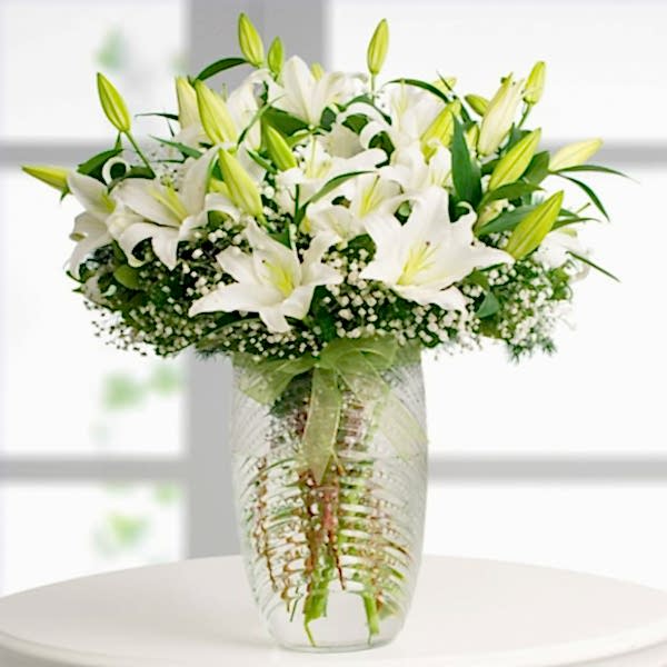 Sevdiklerinizi sade ve şık bir aranjmanla mutlu etmek ister misiniz? Vip vazoda yeşilliklerle süslü beyaz lilyumlar ile tasarlanmış Sadeliğin Işıltısı özel koleksiyon çiçek aranjmanı, çok özel bir jest olacak.
