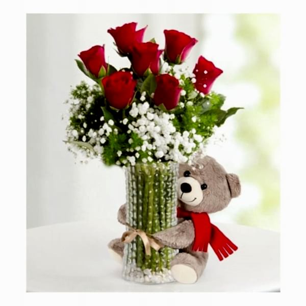 Cam Vazoda 7 adet kırmızı gül Ayıcıklı Arajman
