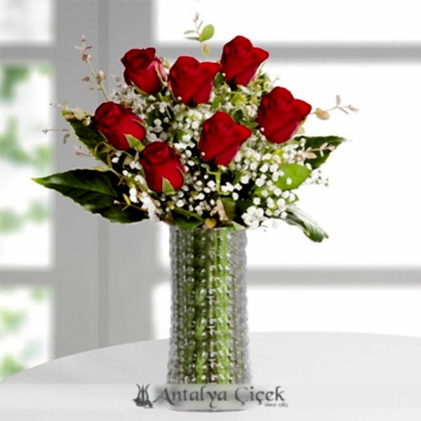 Cam vazo içerisinde özenle hazırlanmış 7 adet kırmızı gül, yeşillik ve cipsolardan oluşan özel gül aranjmanı.