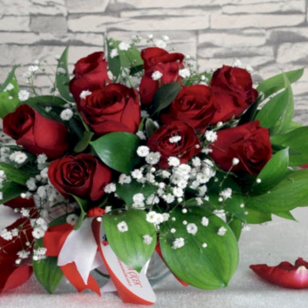 9 Adet Kırmızı Gül Cipso ve Yeşillikler Dekoratif Taşlar Cam Kalp Vazo
