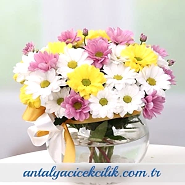 Çiçek Açıklaması Rengarenk Papatyalar Yaklaşık Ürün Boyutu : 30 cm Kullanılan Diğer Ürünler : Yeşillik, Cam Fanus Renklerin en güzel ahengini yakalayan papatya aranjmanı ile sevdiklerinize kalbinizde taşıdıklarınızı anlatmanız çok ama çok kolay.