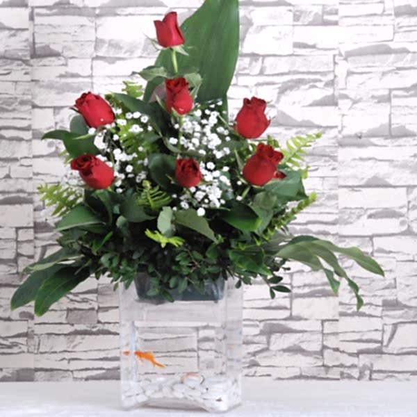 Cam Vazoda Balıklı ve 9 Gülden Oluşan Sevgi Çiçeği Balık rengi farklılık gösterir.