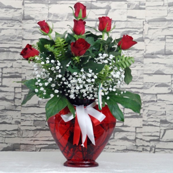 7 Adet Kırmızı Gül Cipso Ve Yeşillikler Kırmızı Kalp Cam Vazo Sevgilinize Hediye Edebileceğiniz Zarif Bir Çiçek