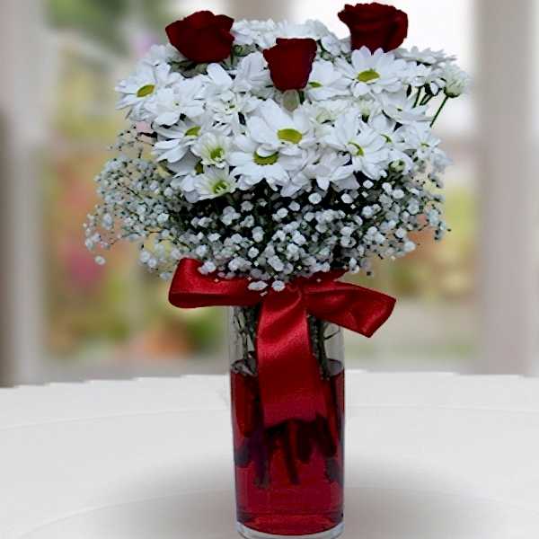 3 Adet Kırmızı Gül Beyaz Kasımpatılar Cipsolar Kırmızı Kurdele Silindir Cam Vazo